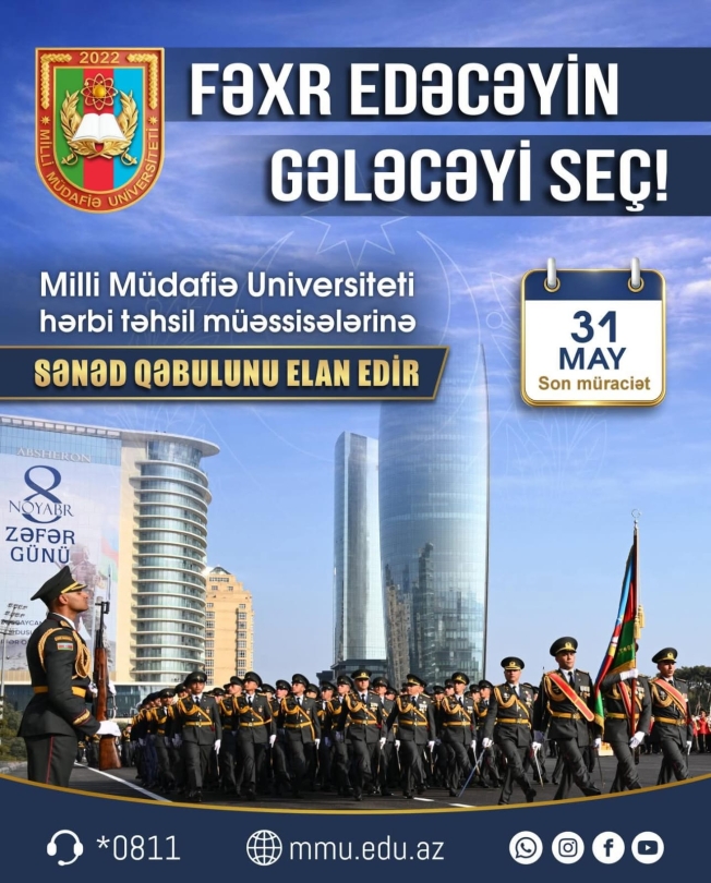 Müdafiə Nazirliyinin Milli Müdafiə Universiteti cari ilin 31 may tarixinədək Heydər Əliyev adına Hərbi İnstituta, Hərbi Tibb Fakültəsinə, Bakı və Naxçıvan Hərbi Kolleclərinə, Heydər Əliyev adına və Cəmşid Naxçıvanski adına Hərbi Liseylərinə elektron sənəd qəbulu elan edib.