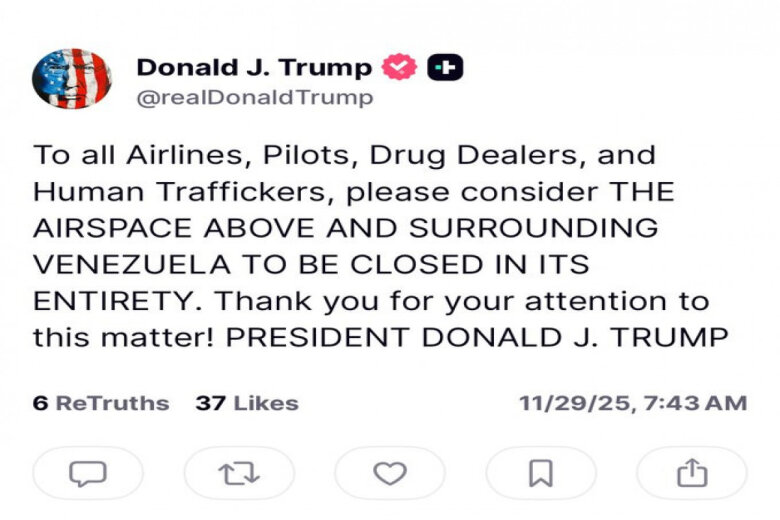 “Bütün aviaşirkətlərə, pilotlara, narkotik satıcılarına və insan alveri ilə məşğul olanlara müraciət edirəm - Venesuela üzərində və onun ətrafındakı hava məkanını tam bağlı hesab edin”.(APA)