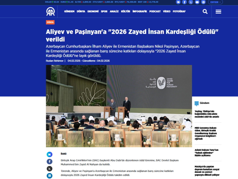 Reyting.az AZƏRTAC-a istinadla xəbər verir ki, Türkiyənin rəsmi Anadolu agentliyinin materialında “Zayed İnsan Qardaşlığı Mükafatı”nın təqdimolunma mərasimində dövlət və hökumət başçıları Rəcəb Tayyib Ərdoğan, Kasım-Jomart Tokayev, Şavkat Mirziyoyev, Sadır Japarov, Kral II Abdulla, Şahbaz Şərifin Azərbaycan Prezidentinin müdrik və düşünülmüş rəhbərliyi sayəsində regionda sülhün və təhlükəsizliyin bərqərar olması barədə fikirləri yer alıb. Agentlik vurğulayıb ki, Prezident İlham Əliyev mərasimdəki çıxışında Azərbaycan ilə Ermənistan arasında sülhün təkcə iki ölkə üçün deyil, bütün geniş region üçün əhəmiyyətini vurğulayıb. Materialda diqqətə çatdırılıb: “Zayed İnsan Qardaşlığı Mükafatı”na görə təşəkkürünü bildirən Azərbaycan Prezidenti qeyd edib ki, Vaşinqtonda imzalanan Birgə Bəyannamədən ötən altı ay Azərbaycan-Ermənistan münasibətlərinin inkişafı baxımından çox mühüm olub. Yazıda Prezident İlham Əliyevin aşağıdakı sözləri sitat gətirilib: “Biz təkcə Azərbaycan ərazisindən Ermənistana yük daşımalarına qoyulmuş məhdudiyyətləri aradan qaldırmadıq, eyni zamanda, Ermənistana neft məhsullarının ixracına da başladıq. Yəni bu altı ay ərzində biz əməkdaşlığa başlamışıq. Hazırda ticarət əlaqələrimizi genişləndiririk. Bu səhər ermənistanlı həmkarımla görüşdüm və gələcək addımlarımızı müzakirə etdik”.