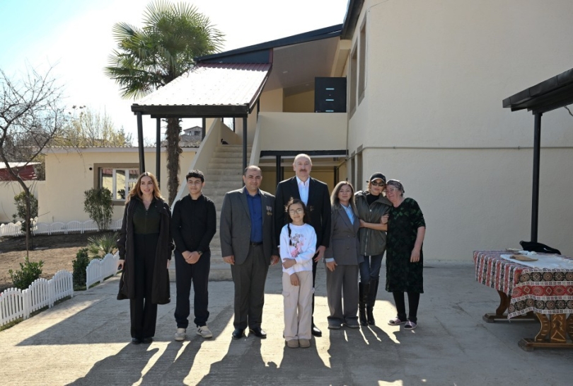 Sonra Prezident İlham Əliyev, birinci xanım Mehriban Əliyeva və qızları Arzu Əliyeva Xocavənd şəhərinə köçmüş İlqar Həsənovun evində olublar və söhbət ediblər.