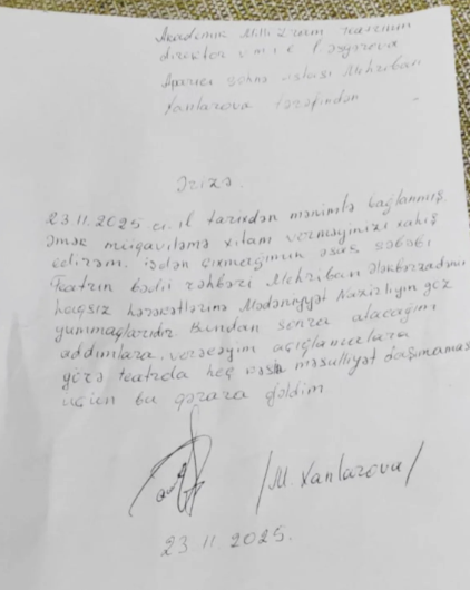 Əməkdar artist bildirib ki, söz azadlığına məhdudiyyətlərlə üzləşdiyi üçün işdən çıxarılma ehtimalını gözə alaraq ərizə yazıb: