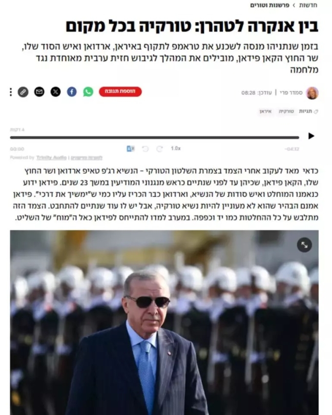 Təhlilin ən diqqətçəkən hissələrindən biri İsrail baş naziri Netanyahunun Vaşinqtonda Trampa “Türkiyə təhdidi” adlı sənəd təqdim etməyə hazırlaşmağı ilə bağlı iddiadır. Nəhayət, Səudiyyə Ərəbistanı, Misir, İordaniya və Qətərin İranla diplomatik münasibətlər saxladığı, eyni zamanda Vaşinqtonla güclü əlaqələri olduğu, lakin İsraillə münasibətlərində ciddi fikir ayrılıqları qeyd edilib.