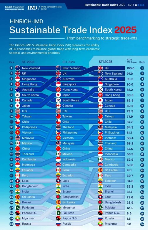 2025-ci ildə dünya ölkələrinin dayanıqlı iqtisadiyyatlarının reytinqi açıqlanıb. "Hinrich Foundation" və "IMD World Competitiveness Center"-in birlikdə hazırladıqları "Sustainable Trade Index 2025" reytinqində Böyük Britaniya ilk yerdədir.
