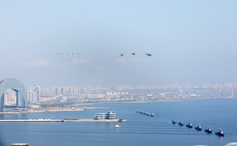Paradda, həmçinin Xəzər dənizində döyüş gəmiləri və katerlər də nümayiş etdirilib. Bu, Azərbaycanın region sularında suverenlik və strateji nəzarət qabiliyyətinin sarsılmaz gücünü göstərir.