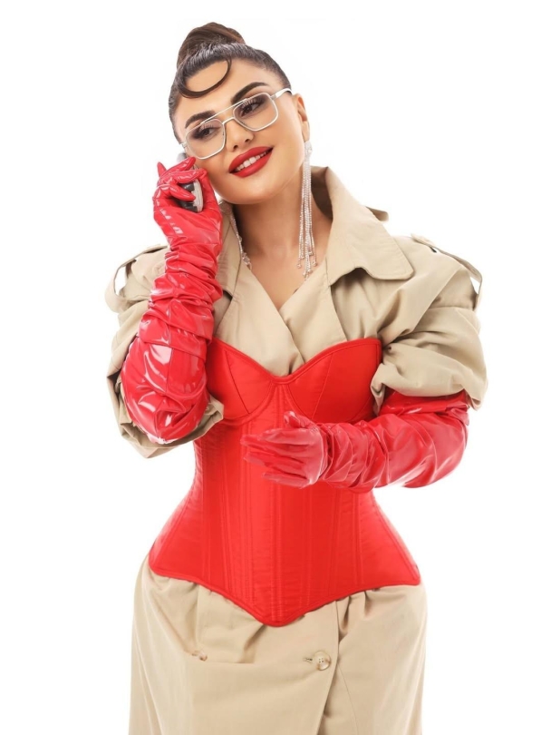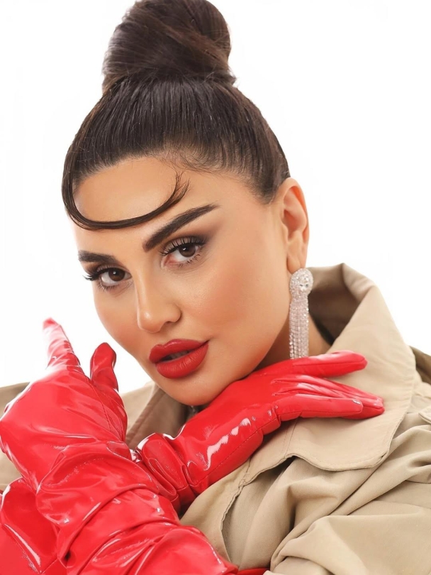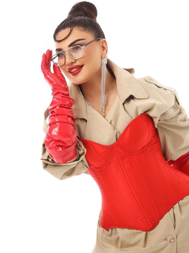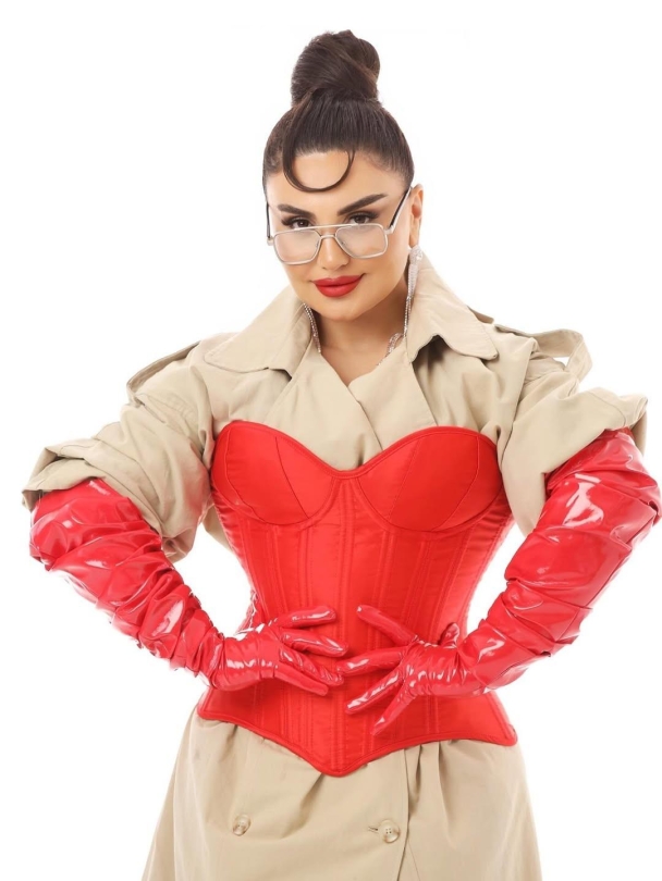 Reyting.az xəbər verir ki, sənətçi kamera qarşısına krem rəngli plaşla çıxıb və geyimin üstündən qırmızı korset seçib. Obrazını qırmızı dəri əlcəklər və eynəklə tamamlayan Şəbnəm, fərqli üslubu ilə seçilib.