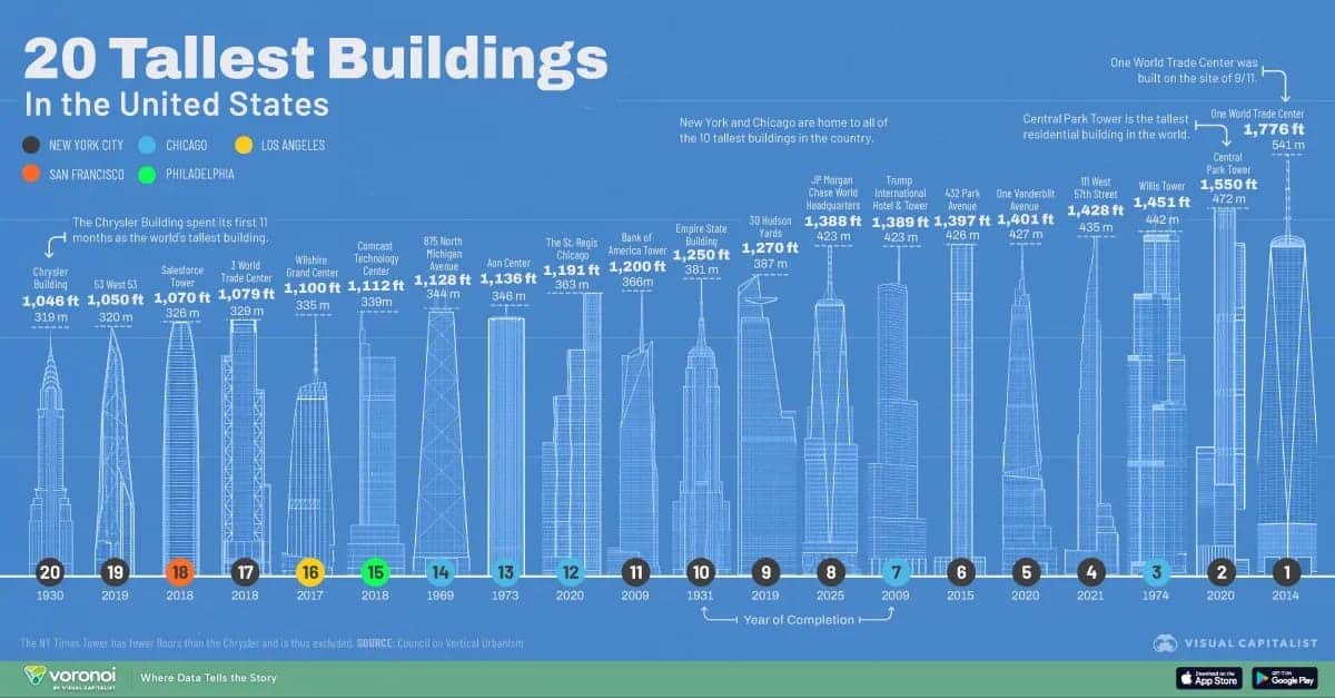 ABŞ dünyanın ən hündür göydələnlərinə ev sahibliyi edən ölkələrdən biridir. 2026-cı il üçün təqdim olunmuş infoqrafik hesabata əsasən, ABŞ ərazisində ən hündür binaların əksəriyyəti Nyu-York və Çikaqo şəhərlərində yerləşir. İlk iyirmilikdə olan binaların 14-ü məhz bu iki şəhərin payına düşür.