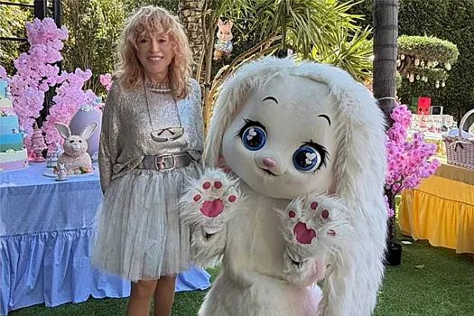 76 yaşlı müğənni gümüşü rəngdə köynək, tam mini ətəkli yubka və balet qoftası ilə kamera qarşısına keçib. O, dovşan müqəvvasının böyründə şəkil çəkdirib.