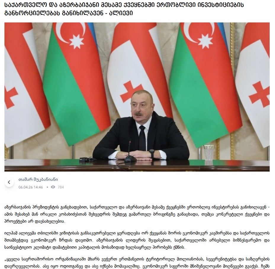 kvirispalitra.ge də dövlətimizin başçısının fikirlərinə geniş yer ayırıb: “Cənab Baş nazir Azərbaycanla Ermənistan arasındakı sülh prosesinə də toxundu. Deyə bilərəm ki, bu prosesi gücləndirmək üçün, sadəcə olaraq, imzalanmış sənədlər yetərli deyil. Biz hər an, hər addım atıldıqda gərək bu sülhü gücləndirək və bunun ən yaxşı istiqaməti də ticarətdir. Bu gün Azərbaycanla Ermənistan arasında ticarət Gürcüstan vasitəsilə həyata keçirilir. Buna görə Gürcüstan hökumətinə öz təşəkkürümü bildirmək istərdim.