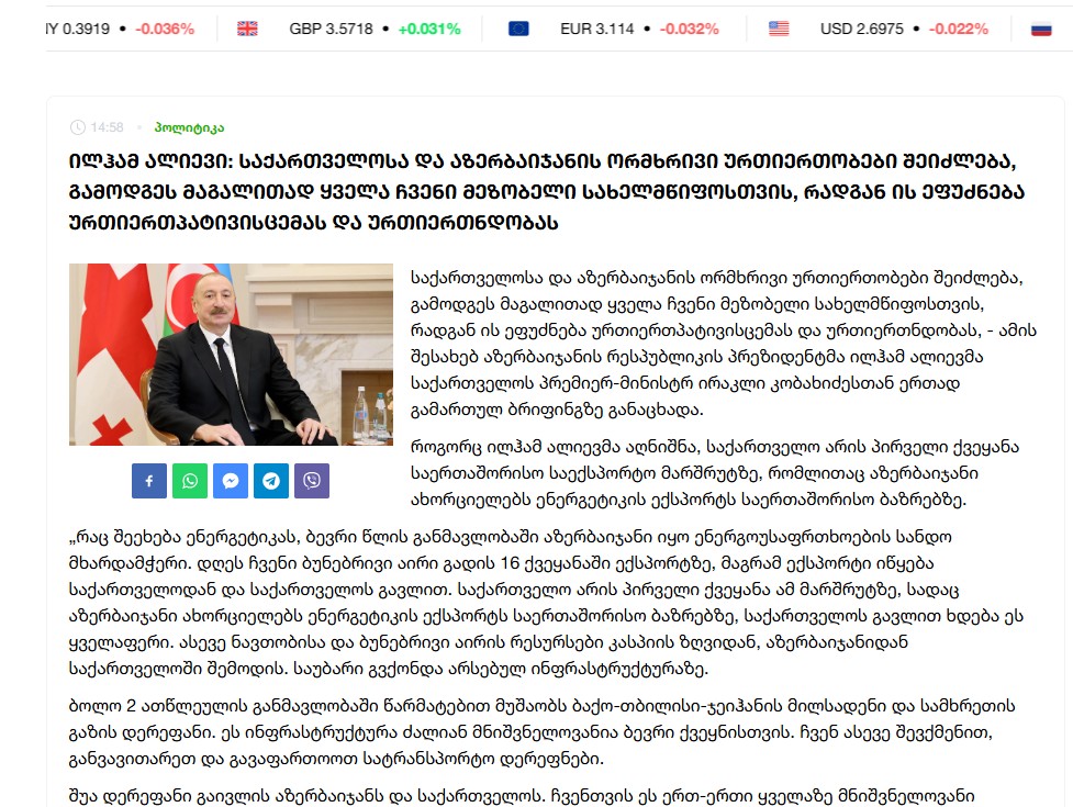 “İpress.ge” saytı da Prezident İlham Əliyevin fikirlərinə yer verib: “Azərbaycan nefti, qazı Gürcüstan vasitəsilə dünya bazarlarına çıxarılır, həm də Xəzərin şərq sahillərindən neft resursları Azərbaycan, Gürcüstan üzərindən keçirilir. Artıq 20 ildir ki, Bakı-Tbilisi-Ceyhan neft kəməri uğurla fəaliyyət göstərir. Cənub Qaz Dəhlizi də ondan sonra icra edilmişdir və bu gün bu infrastruktur, əslində, böyük coğrafiya üçün mühüm əhəmiyyət daşıyır. Biz sonra bu dəhlizlər üzərindən nəqliyyat dəhlizlərini də inşa etdik və bu gün nəqliyyat dəhlizlərinin genişləndirilməsi istiqamətində işlər aparılır. Orta Dəhliz Azərbaycan və Gürcüstan üzərindən keçir. Bu bizim üçün əsas nəqliyyat damarıdır və bunu genişləndirmək üçün əlavə səylər də göstərilir və göstəriləcəkdir”.